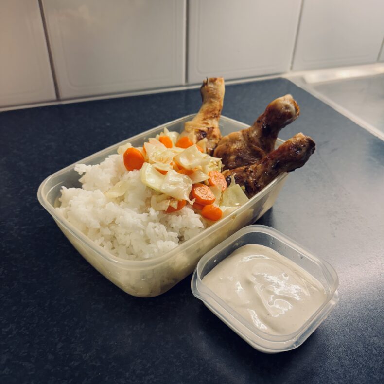 - Fördela riset i 4 matlådor, lägg på wokade grönsaker och 3 kycklingben per låda.