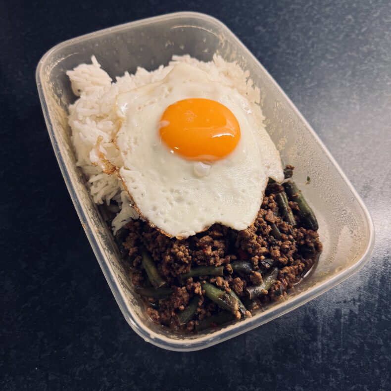 Pad Kra Pao med nötfärs, jasminris & stekt ägg